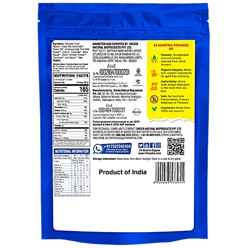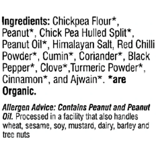 Chickpea Flour*, Peanut*, Chick Pea Hulled Split*, Peanut Oil*, Himalayan Salt, Red Chilli Powder*, Cumin*, Coriander*, Black Pepper*, Clove*, Turmeric Powder*, Cinnamon*, Ajwain*