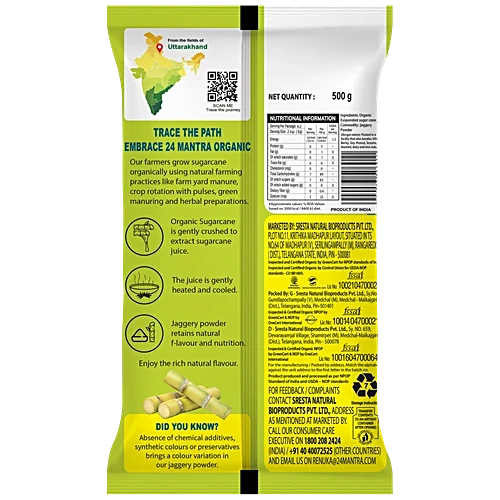 The 24 Mantra – Organic Jaggery Powder is the ideal substitute for refined sugar to help you enjoy sweet delicacies guilt-free. Made from organic sugarcane and naturally farmed without chemicals and harmful pesticides, this 24 Mantra Organic Jaggery powder is healthy and naturally sweet, filled with minerals like iron and magnesium. This jaggery powder helps keep your diet rich in nutrients while also ensuring taste. Add this powdered jaggery to your morning black tea or your favourite summer drink. It is even used to prepare traditional sweets, curries, and gravies. Explore the wide range of organic groceries from 24 Mantra like jaggery, sugar, and more, only on Big Basket.