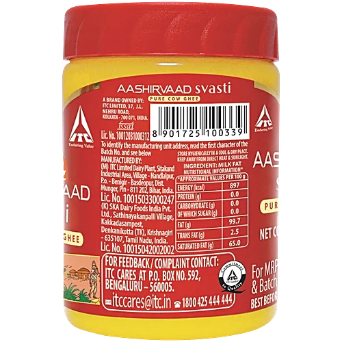 Aashirvaad, the brand that you trust and love, always ensures that only the best quality products reach your kitchen and Aashirvaad Svasti Pure Cow Ghee stays true to that. This desi ghee has been made with love in India, going through a 4-stage stringent quality process.