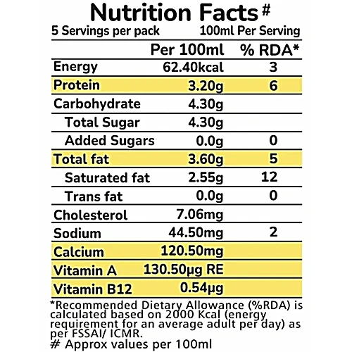 Nutrition per gram/ml: 100ml Serving Size: 100ml Energy: 62.40kcal Protein: 3.20g Carbohydrate: 4.30g Total Sugar: 4.30g Added Sugars: 0.0g Total fat: 3.60g Saturated fat: 2.55g Trans fat: 0.0g Cholesterol: 7.06mg Sodium: 44.50mg Calcium: 120.50mg Vitamin A: 130.50pg RE Vitamin B12: 0.54ug