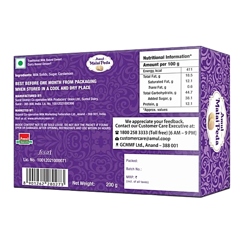 Indulge in the delectable taste of Amul Fresh sweets, traditional Indian dairy products that are a cherished part of every occasion and meal. These delightful treats will melt in your mouth, delighting your taste buds with their rich, creamy flavour. Crafted from pure Amul milk using honest, hygienic ingredients, these sweets are perfect for sharing with guests or savouring alone. Enjoy the convenience of the 200g pack, which is ideal for both sharing and personal enjoyment. With a shelf life of 15 days, you can relish the sweetness of Amul Malai Peda whenever the craving strikes. Discover the perfect balance of tradition and modernity in every bite of these Amul dairy delights.
