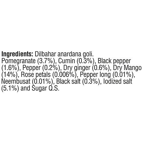 Pomegranate (3.7%), Cumin (0.3%), Black Pepper (1.6%), Pepper (0.2%), Dry Ginger (0.6%), Dry Mango (14%), Rose Petals (0.006%), Pepper Long (0.01%), Neembusat (0.01%), Black Salt (0.3%), Iodized Salt (5.1%) And Sugar Q.s.