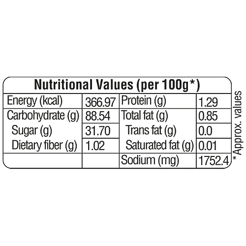 Nutrition per gram/ml: 100g Energy (kcal): 366.97 Protein (g): 1.29 Carbohydrate (g): 88.54 Total fat (g): 0.85 Sugar (g): 31.70 Trans fat (g): 0.0 Dietary fiber (g): 1.02 Saturated fat (g): 0.01 Sodium (mg): 1752.4
