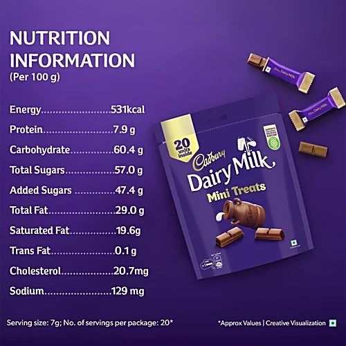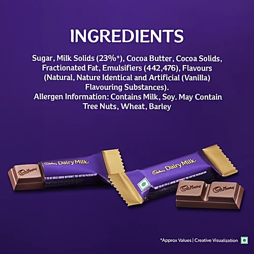 Kuch achha ho jaaye, kuch meetha ho jaaye with Cadbury Dairy Milk. Generously made with a glass and a half of milk, offering a mouthful of goodness in every piece. Cadbury Dairy Milk is the perfect meetha for sharing everyday moments of joy with your loved ones. This milk chocolate bar pack is perfect for snacking & storing in the fridge, or as a chocolate gift pack for gifting on special occasions like birthdays and get-togethers. Every chocolate bar of Cadbury Dairy Milk is made from sustainably sourced cocoa. It is suitable for vegetarians.