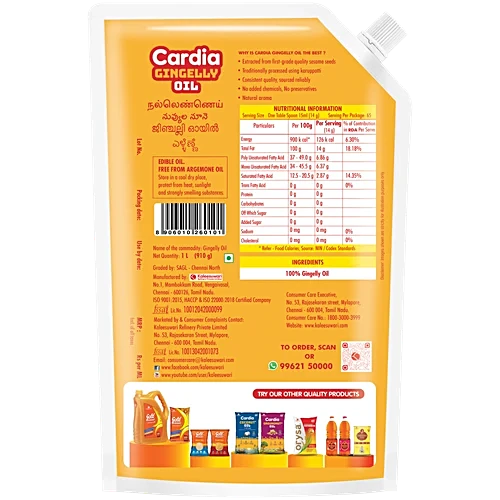 - Experience the superior quality of Cardia Gingelly Oil, designed to provide both delicious taste and nutritional benefits. Whether you’re preparing everyday meals or special recipes, this oil is your perfect culinary companion for a healthier lifestyle.