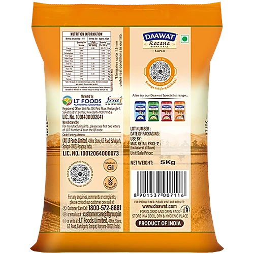 Enhance daily meals with goodness and flavor. With its premium quality raw rice, Rozana Super Basmati Rice ensures an exceptional culinary experience for everyday cooking. Enjoy the rich aroma and superior quality of this basmati rice, making every meal a delightful affair.