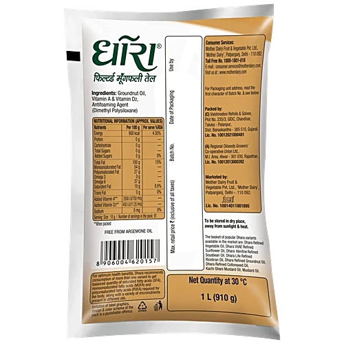 Dhara Filtered Groundnut Oil: The traditional choice for authentic Indian flavours. This premium quality oil is carefully filtered using a traditional extraction process to ensure purity and retain its natural goodness. Groundnut oil is high in monounsaturated good fat and low in saturated bad fat. Dhara Filtered Groundnut Oil with 0% trans-fat is naturally cholesterol-free and rich in antioxidants. Perfect for deep frying, stir-frying, and tempering, this oil enhances the flavour of your favourite Indian dishes. Order Dhara Filtered Groundnut Oil online for authentic Indian cooking.