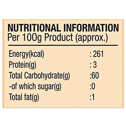 Nutrition per gram/ml: 100g Energy(kcal): 261 kcal Protein(g): 3 g Total Carbohydrate(g): 60 g of which sugar(g): 0 g Total fat(g): 1 g