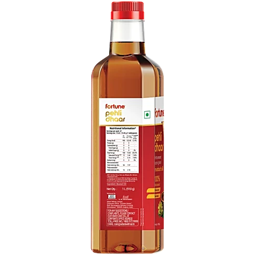 Discover the unparalleled richness and aroma of Fortune Pehli Dhaar First Pressed Mustard Oil. Crafted using the finest quality mustard seeds, this oil is gently pressed in a traditional wooden Kolhu to preserve the natural essential oils, ensuring the full-bodied flavour and vibrant colour in every drop. Boasting a distinct mustard taste and unbeatable aroma, this cold-pressed oil is the perfect companion for your culinary adventures. Ideal for everyday cooking, it enhances the taste of a wide range of Indian dishes, from curries to pickles, adding depth and complexity to your favourite recipes. Packed with heart-healthy Omega-3 fatty acids and antioxidants, Fortune Pehli Dhaar Mustard Oil offers a healthier cooking option that supports overall wellness. Discover the perfect balance of tradition and modernity with this exceptional first-pressed mustard oil.