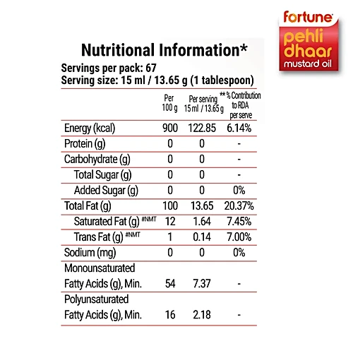 Nutrition per gram/ml: 100g Serving Size: 15 ml / 13.65 g (1 tablespoon) Energy (kcal): 122.85 Protein (g): 0 Carbohydrate (g): 0 Total Sugar (g): 0 Added Sugar (g): 0 Total Fat (g): 13.65 Saturated Fat (g): 1.64 Trans Fat (g): 0.14 Sodium (mg): 0 Monounsaturated Fatty Acids (g), Min.: 7.37 Polyunsaturated Fatty Acids (g), Min.: 2.18