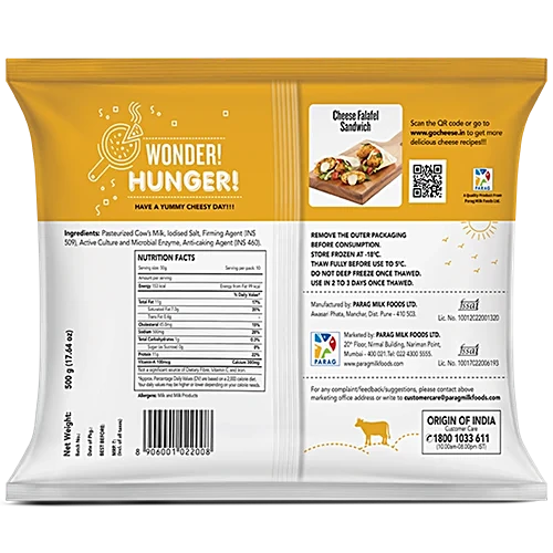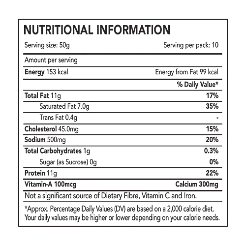 Nutrition per gram/ml: 100g Serving Size: 50g Energy: 153 kcal Energy from Fat: 99 kcal Total Fat: 11g Saturated Fat: 7.0g Trans Fat: 0.4g Cholesterol: 45.0mg Sodium: 500mg Total Carbohydrates: 1g Sugar (as Sucrose): 0g Protein: 11g Vitamin-A: 100mcg Calcium: 300mg