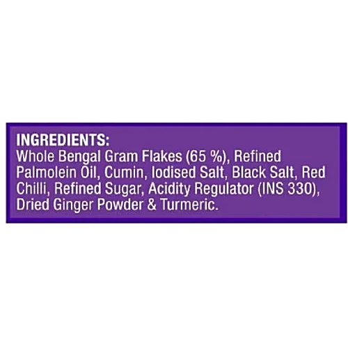 Whole Bengal Gram Flakes, Refined Palmolein Oil, Cumin, Iodised Salt, Black Salt, Red Chilli, Refined Sugar, Acidity Regulator (INS 33), Dried Ginger Powder, Turmeric
