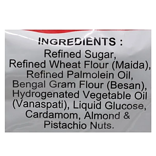 Refined Sugar, Refined Wheat Flour, Refined Palmolein Oil, Bengal Gram Flour, Hydrogenated Vegetable Oil, Liquid Glucose, Almonds, Cardamom And Pistachio Nuts