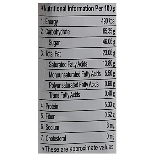 Nutrition per gram/ml: 100g Energy: 490 kcal Carbohydrate: 65.35 g Sugar: 46.06 g Total Fat: 23.06 g Saturated Fatty Acids: 13.80 g Monounsaturated Fatty Acids: 5.50 g Polyunsaturated Fatty Acids: 0.60 g Trans Fatty Acids: 0.40 g Protein: 5.33 g Fiber: 0.62 g Sodium: 8 mg Cholesterol: 0 mg