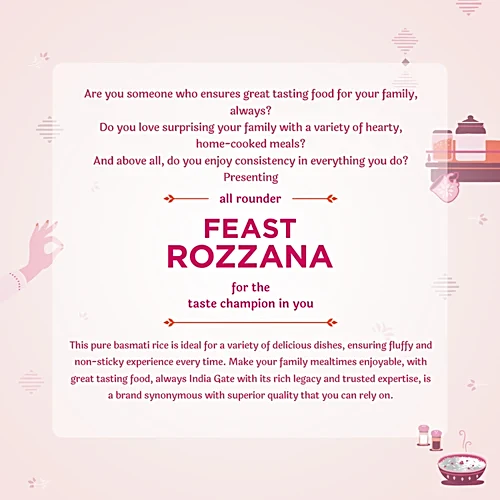 Great Taste Always with India Gate Feast Rozzana Basmati Rice—carefully selected and expertly aged for a delightful burst of flavours in every bite. With ideal grain length and vibrant colour, this flavourful Basmati is perfect for Indian dishes and daily cooking, enhancing both taste and presentation. Enjoy Feast Rozzana Basmati Rice for a premium-quality experience in every meal.
