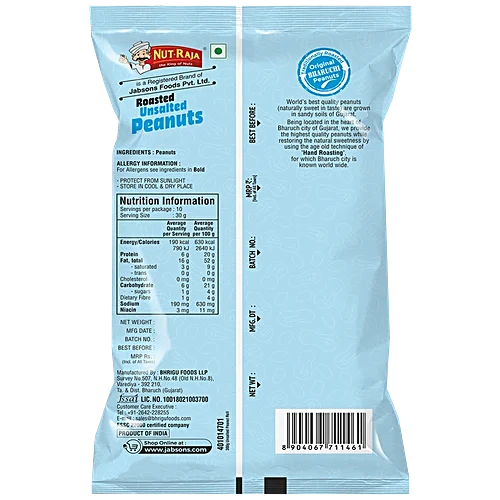 Nutrition per gram/ml: 100g Serving Size: 30 g Energy/Calories: 630 kcal Protein: 20 g Fat, total: 52 g Fat, saturated: 9 g Fat, trans: 0 g Cholesterol: 0 mg Carbohydrate: 21 g Carbohydrate, sugars: 4 g Dietary Fibre: 4 g Sodium: 630 mg Niacin: 11 mg