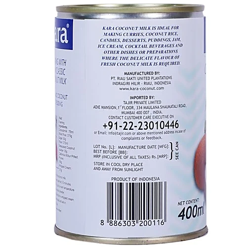 Tajir Coconut Milk is ideal for making curries, coconut rice, candies, desserts, puddings, jam, ice cream, cocktail beverages and other dishes or preparations where the delicate flavour of fresh coconut milk is required. As the coconut specialist, Kara takes pride in the product integrity by using carefully hand-picked fresh coconuts from their lush plantation in Indonesia. Their involvement from seeding to processing allows them to monitor the product integrity closely and efficiently, ensuring only the finest quality Kara products with the natural flavour of fresh coconuts are being produced.