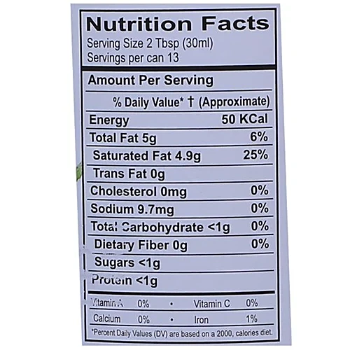 Nutrition per gram/ml: 100ml Serving Size: 30ml Energy: 50 KCal Total Fat: 5g Saturated Fat: 4.9g Trans Fat: 0g Cholesterol: 0mg Sodium: 9.7mg Total Carbohydrate: <1g Dietary Fiber: 0g Sugars: <1g Protein: <1g Vitamin A: 0% Vitamin C: 0% Calcium: 0% Iron: 1%