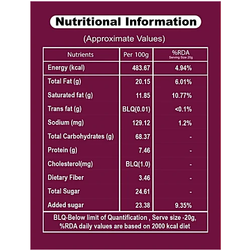 Nutrition per gram/ml: 100g Serving Size: 20g Energy (kcal): 483.67 Total Fat (g): 20.15 Saturated fat (g): 11.85 Trans fat (g): BLQ(0.01) Sodium (mg): 129.12 Total Carbohydrates (g): 68.37 Protein (g): 7.46 Cholesterol(mg): BLQ(1.0) Dietary Fiber: 3.46 Total Sugar: 24.61 Added sugar: 23.38