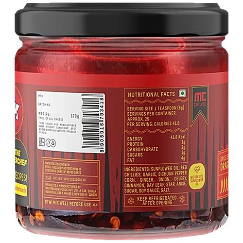 Indulge in the bold and fiery flavours of MasterChow’s 2X Sichuan Chilli Oil, a versatile condiment crafted for the spice-loving palate. Infused with a blend of Patna, Kashmiri and Baidgyi chillies that are slow-roasted to perfection, this oil delivers a balanced kick of heat that will elevate your favourite dishes. Drizzle it over savoury snacks for a crunchy, spicy flavour punch, or use it as a versatile topping to add a delightful Sichuan-inspired twist to any meal. Enriched with the aromatic notes of Sichuan peppercorns, this natural chilli oil promises to take your taste buds on an unforgettable culinary adventure.