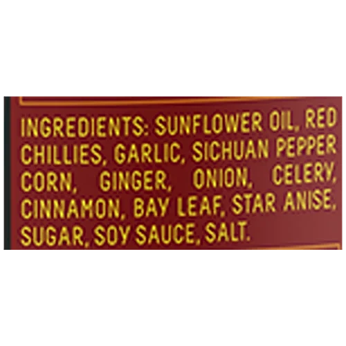 Sunflower Oil, Red Chillies, Garlic, Sichuan Peppercorn, Ginger, Onion, Celery, Cinnamon, Bayleaf, Star Anise, Sugar, Soy Sauce & Salt