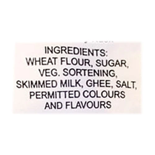 Wheat flour, sugar, vegetable shortening,ghee,salt, permitted colors and flavors.