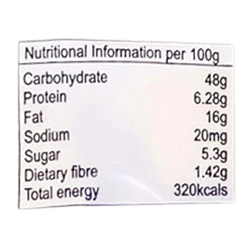 Nutrition per gram/ml: 100g Carbohydrate: 48g Protein: 6.28g Fat: 16g Sodium: 20mg Sugar: 5.3g Dietary fibre: 1.42g Total energy: 320kcals