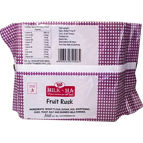 Milkma Fruit Rusk is a delicious blend of finest quality wheat and fruit bits baked with the goodness of home. Its crispy texture and delicious fruity taste makes it a great snack that can be enjoyed by people of all ages.