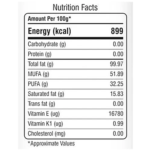 Nutrition per gram/ml: 100g Energy (kcal): 899 Carbohydrate (g): 0.00 Protein (g): 0.00 Total fat (g): 99.97 MUFA (g): 51.89 PUFA (g): 32.25 Saturated fat (g): 15.83 Trans fat (g): 0.00 Vitamin E (ug): 16780 Vitamin K1 (ug): 0.99 Cholesterol (mg): 0.00