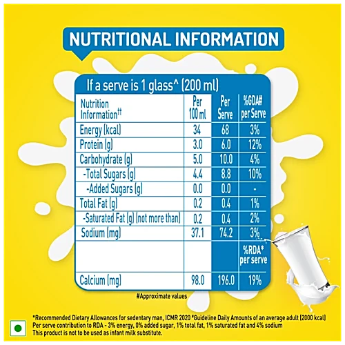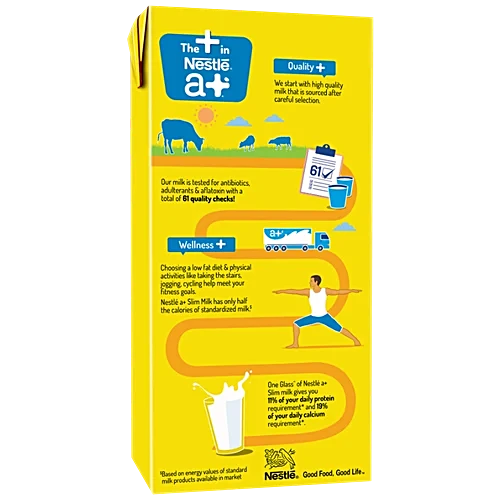 Nestlé a+ Slim Milk is low-fat milk with just 0.4% fat, making it a smart choice for fitness and calorie control. It offers the same goodness of regular milk with 95% less fat, plus calcium and protein. UHT-treated and packed in 6-layer protection, it undergoes 61 stringent quality checks for purity, including tests for adulterants, antibiotics, and aflatoxin.