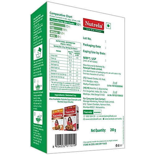 Patanjali Foods Ltd Nutrela Soya Mini Chunks are made from soy flour. Soya Chunks contain immunity building nutrients, protein, iron and zinc. It is rich in dietary fiber and strengthens your immunity. It is very easy to prepare and makes tasty dishes. They are a blank canvas that you can paint on, they are odourless and tasteless by themselves. It can be used in many dishes and it is healthy and a good source of calcium. It is also a great replacement for chicken or any other meat.