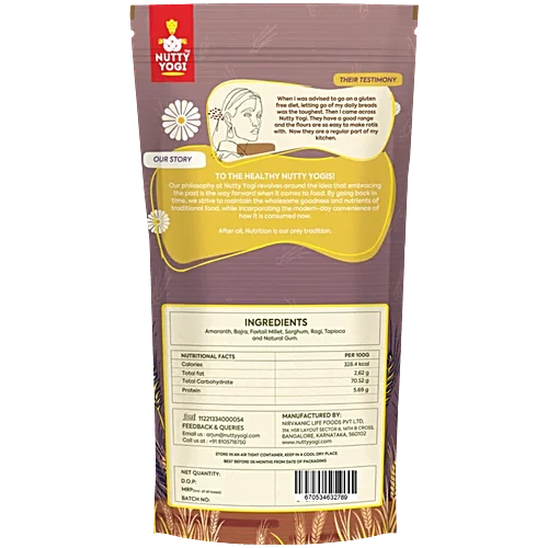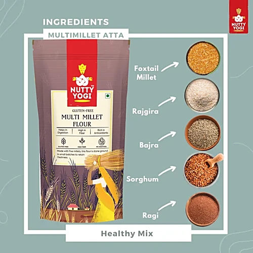 Nutty Yogi Multi Millet Atta is made from natural and healthy ingredients. It is made from millets like jowar, ragi, bajra and Kodo with amaranth. It is 100% natural without any preservative and has several health benefits.