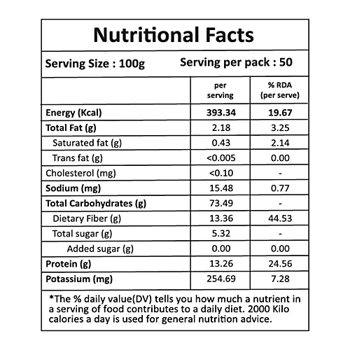 Nutrition per gram/ml: 100g Serving Size: 100g Energy (Kcal): 393.34 kcal Total Fat (g): 2.18 g Saturated fat (g): 0.43 g Trans fat (g): <0.005 g Cholesterol (mg): <0.10 mg Sodium (mg): 15.48 mg Total Carbohydrates (g): 73.49 g Dietary Fiber (g): 13.36 g Total sugar (g): 5.32 g Added sugar (g): 0.00 g Protein (g): 13.26 g Potassium (mg): 254.69 mg