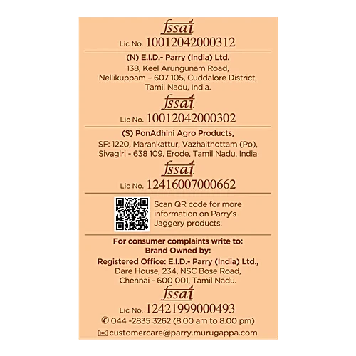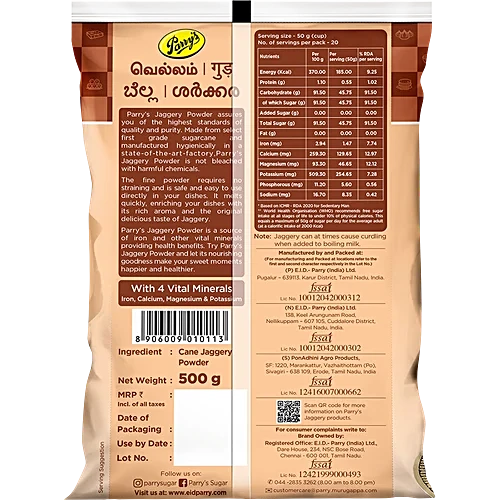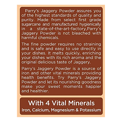 Parry’s Jaggery Powder is fine jaggery produced using the highest standards of hygiene. Produced in a modern factory, it is untouched by hand and is factory packed. It is easy to use as it doesn’t need to be graded, melted, or strained. It dissolves quickly and blends smoothly with your preparations. Parry’s Jaggery Powder is rich in 4 vital minerals essential for the body – Calcium, Magnesium, Potassium, and Iron. Extracted from high-quality sugarcane, the ready-to-use jaggery powder ensures tasty and nourishing sweetness.