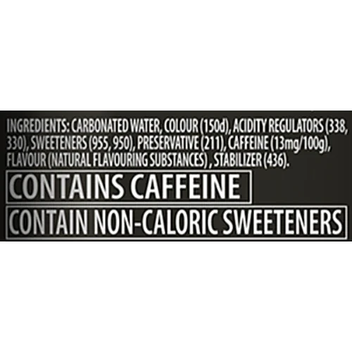 Carbonated Water, Colour (150d), Acidity Regulators (338, 330), Sweeteners (955, 950), Preservative (211), Caffeine (13mg/100g), Flavour (Natural Flavouring Substances), Stabilizer (436)