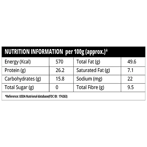 Nutrition per gram/ml: 100g Energy (Kcal): 570 kcal Total Fat (g): 49.6 g Protein (g): 26.2 g Saturated Fat (g): 7.1 g Carbohydrates (g): 15.8 g Sodium (mg): 22 mg Total Sugar (g): 0 g Total Fibre (g): 9.5 g