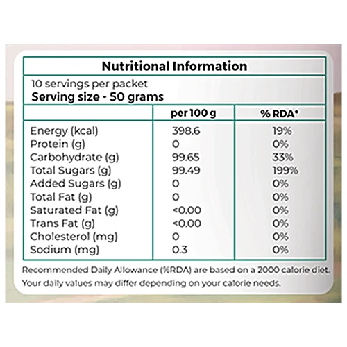Nutrition per gram/ml: 100g Serving Size: 50 grams Energy (kcal): 398.6 Protein (g): 0 Carbohydrate (g): 99.65 Total Sugars (g): 99.49 Added Sugars (g): 0 Total Fat (g): 0 Saturated Fat (g): <0.00 Trans Fat (g): <0.00 Cholesterol (mg): 0 Sodium (mg): 0.3