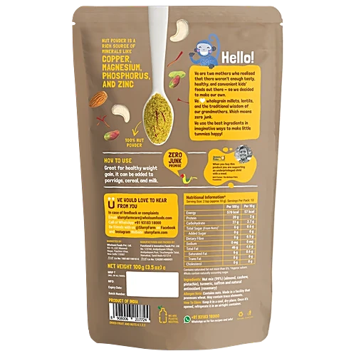 Slurrp Farm 100% Natural Nut Powder is a 100% natural superfood made from almond, cashew, pistachios, saffron and turmeric. It can be added to porridge, cereal, kheer and milk. The product contains no preservatives, additives or sugar. Once opened, it should be stored in an airtight container and consumed within 1 month or before the expiry date, whichever comes earlier.