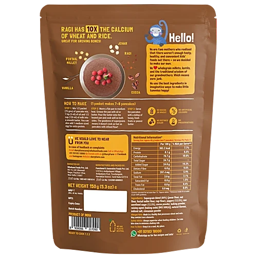 Brimming with the goodness of gluten-free ragi, foxtail millet and cocoa, this nutritious meal boasts 10 times the calcium of wheat and rice, perfect for growing bones. Free from maida and made with natural ingredients, it contains no preservatives, artificial colours or flavours. Ready in just 2 minutes, it’s quick and easy to cook – simply add milk or water. Ideal for breakfast, snack, lunch or dinner, it suits all age groups, from kids to adults, offering a healthy and delicious option anytime.