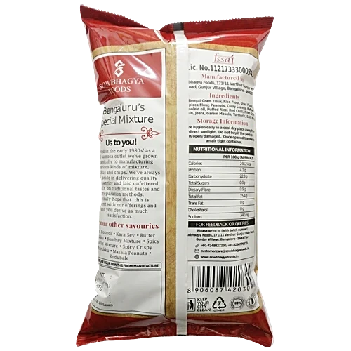 Bengaluru special mixture is primarily made from gram flour. It is made in a traditional style with seasoned boondi and avalakki. We add our in-house special seasoning along with chilli powder, salt, groundnuts, curry leaves.
