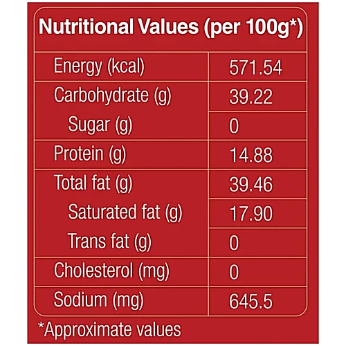 Nutrition per gram/ml: 100g Energy (kcal): 571.54 Carbohydrate (g): 39.22 Sugar (g): 0 Protein (g): 14.88 Total fat (g): 39.46 Saturated fat (g): 17.90 Trans fat (g): 0 Cholesterol (mg): 0 Sodium (mg): 645.5