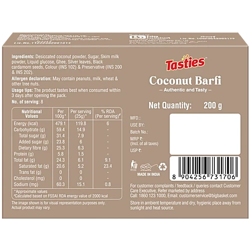 Indulge in the delightful fusion of rich ghee and coconut with Tasties Ghee Coconut Burfi. Each bite is a delightful balance of sweet and nutty flavours, making it an irresistible treat. This traditional Indian sweet is meticulously crafted to perfection, creating a smooth melt-in-your-mouth texture. Whether it’s for festival celebrations or a sweet craving, Tasties Ghee Coconut Burfi offers a taste of authentic goodness that captures the essence of India’s culinary heritage. Share the joy of this sweet delicacy with family and friends or savour it as a special heartwarming indulgence.
