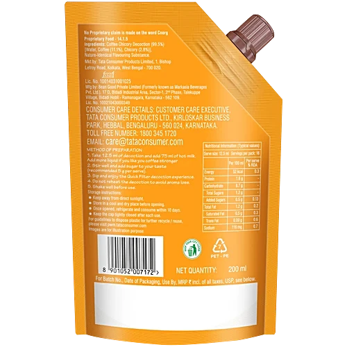 Indulge in the authentic taste of South Indian filter coffee with Tata Coffee Quick Filter Decoction Liquid. Crafted with precision and expertise, this convenient offering captures the rich, aromatic essence of traditional filter coffee without the lengthy brewing process. Blending the finest coffee beans and chicory, each sip transports you to the lush Coorg region, renowned for its exceptional coffee. Enjoy a delightful cup of filter coffee in an instant, savouring the intense flavours and velvety texture that will delight your senses. Whether you’re a coffee connoisseur or seeking a quick caffeine fix, Tata Coffee Quick Filter Decoction Liquid delivers the perfect balance of tradition and convenience, allowing you to experience the true essence of South Indian filter coffee in the comfort of your own home.