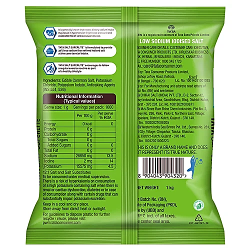 Tata Salt Super Lite Iodized Salt - 30 % Less Sodium, 1 kg quantity