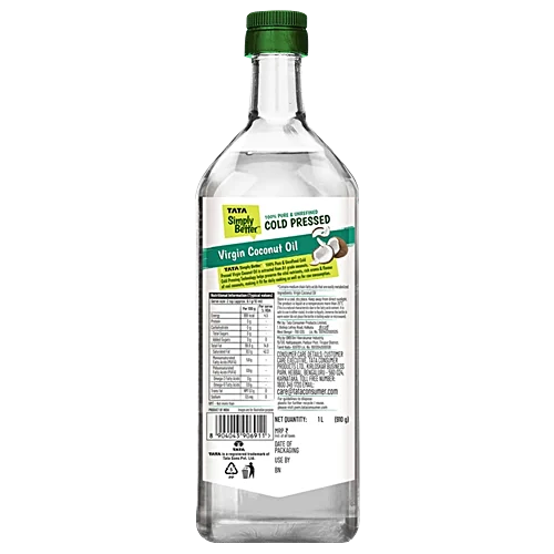 We bring you the goodness of real coconuts with Tata Simply Better Unrefined Cold Pressed Virgin Coconut Oil. Extracted from A1 grade coconuts, this cold-pressed coconut oil ensures purity and aroma in every drop. Cold pressing technology helps preserve the vital nutrients, rich aroma, and flavour of real coconuts, making it suitable for cooking as well as for raw consumption. Tata Simply Better Cold Pressed Coconut Oil is naturally cholesterol-free, 0% trans-fat-free, helps boost energy with 60% MCTs, and is an alternative to refined oils. So, without giving a second thought, make Tata Simply Better Cold Pressed Virgin Coconut Oil – your cooking partner.