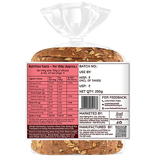 The Health Factory Zero Maida Bread – Simply Multi Grain – offers a wholesome option with a blend of various grains, providing a balanced and satisfying choice for consumers. It aims to cater to those looking for a bread option without refined flour, focusing on natural ingredients and nutritional value. The product is designed to appeal to individuals seeking a healthier alternative to their diet, promoting a balanced approach to nutrition without specific health claims.