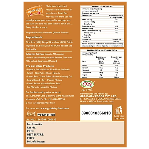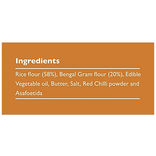 Rice flour (58%), Bengal Gram flour (2%), Edible Vegetable oil, Butter, Salt, Red Chilli powder and Asafoetida