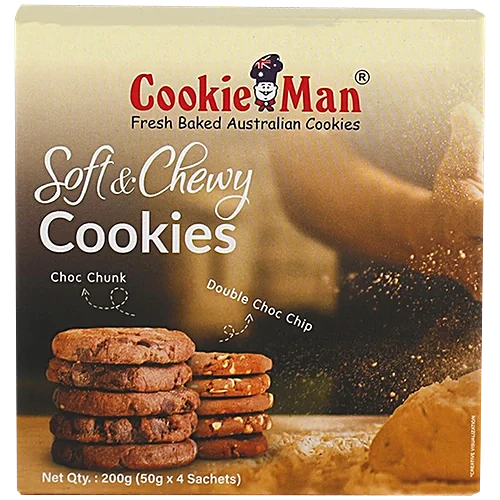 Cookie Man Soft & Chewy Choc Chunk & Double Choc Chip Cookies, 200 g (4 Sachets x 50 g)